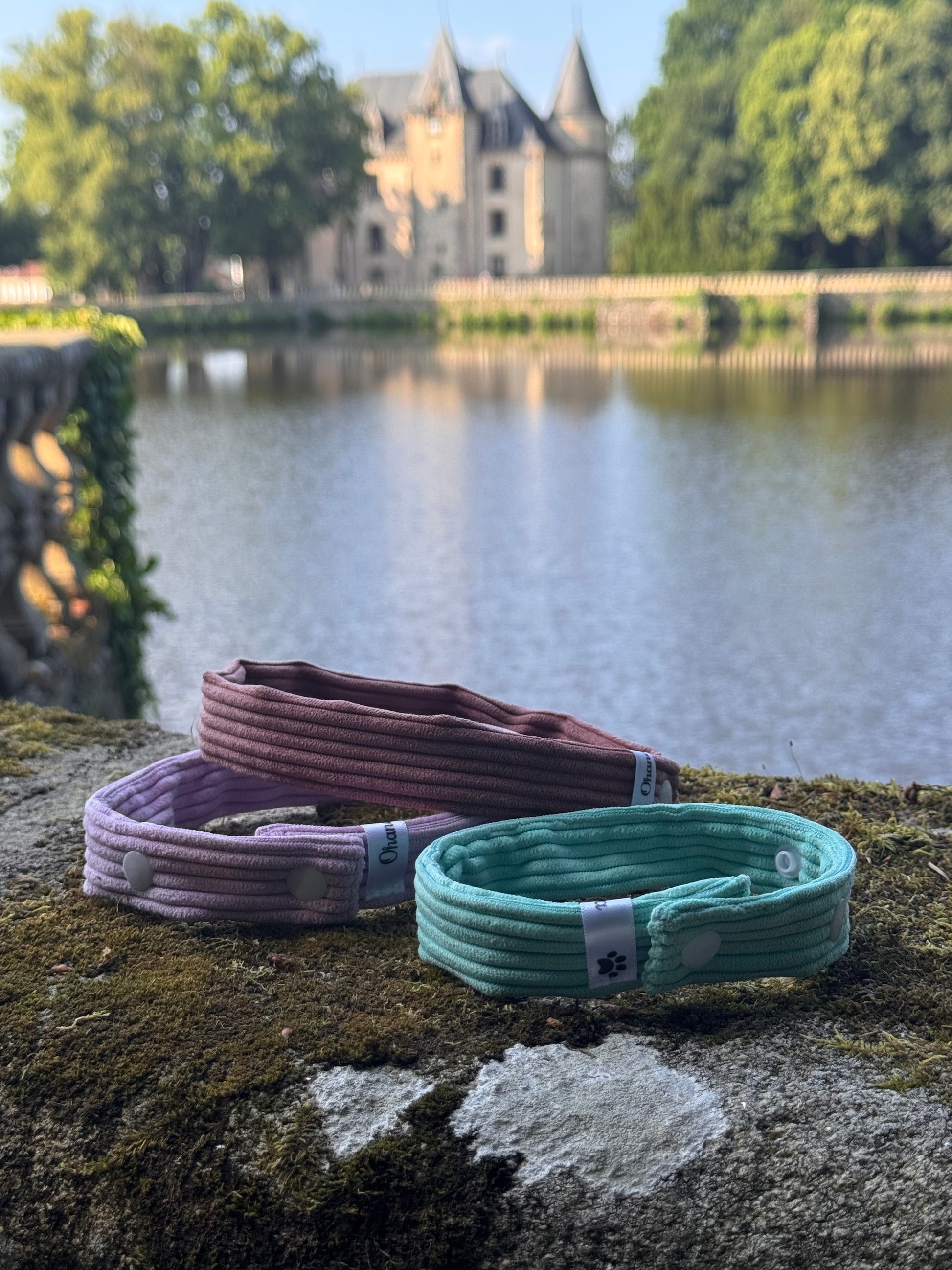 Ce collier en velours côtelé a été imaginé pour celles et ceux qui souhaitent faire porter un nœud tombant à leur compagnon, tout en douceur, sans utiliser un collier de promenade. 🐾