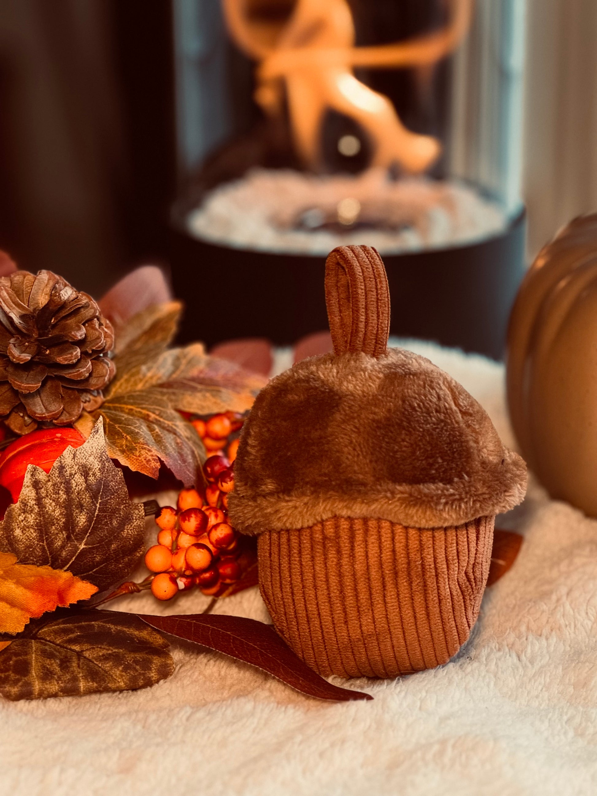 Sa texture moelleuse et son design automnal en font un jouet idéal pour les câlins, les moments de jeu, ou tout simplement pour accompagner les longues soirées cosy.